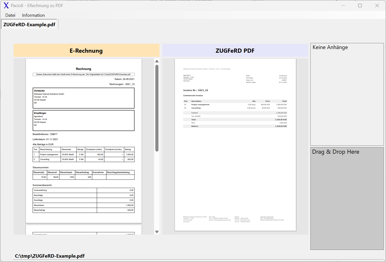 Mit Pacioli können Sie E-Rechnung sowohl im PDF-Format als auch reine XML-Rechnungen anzeigen.